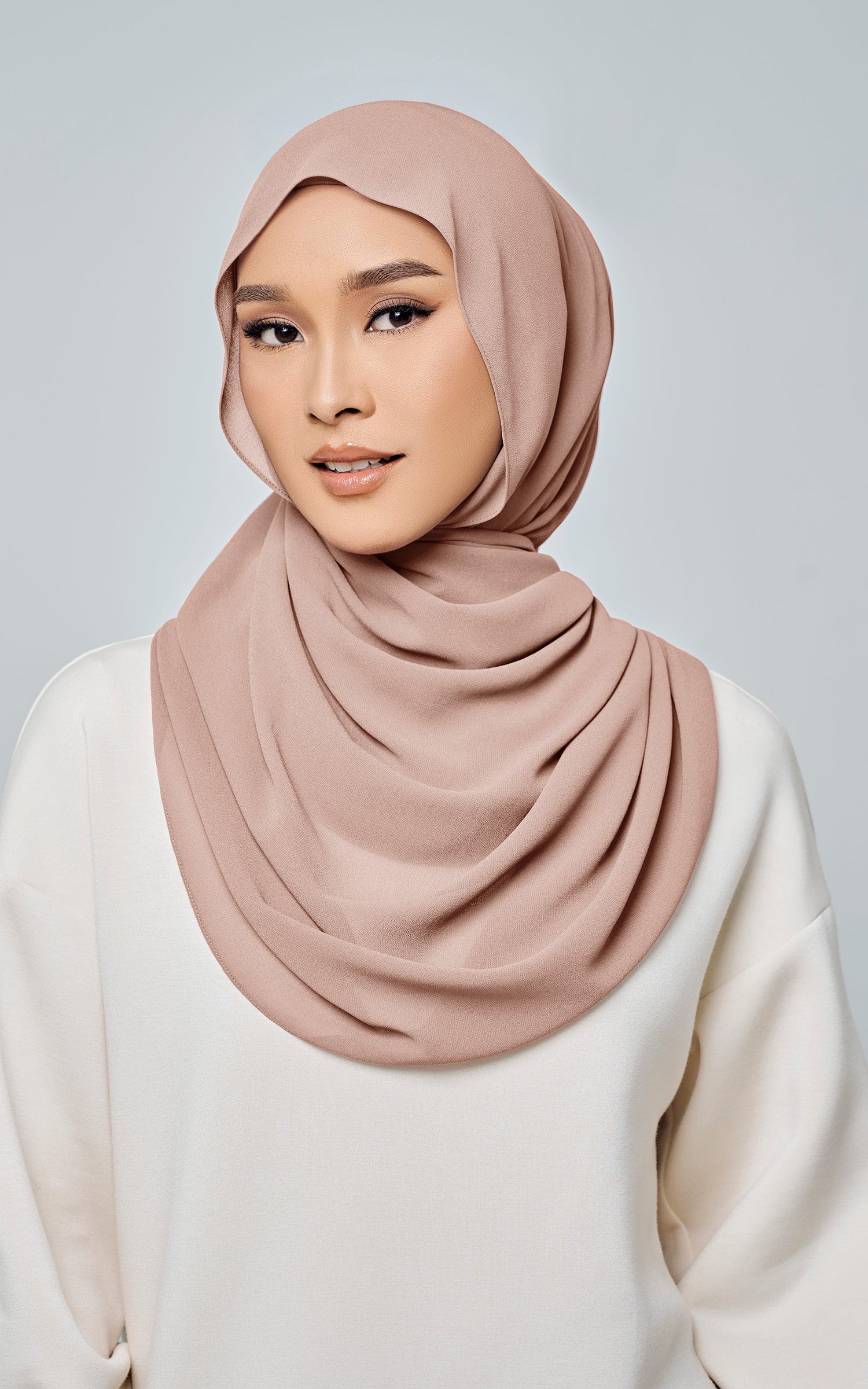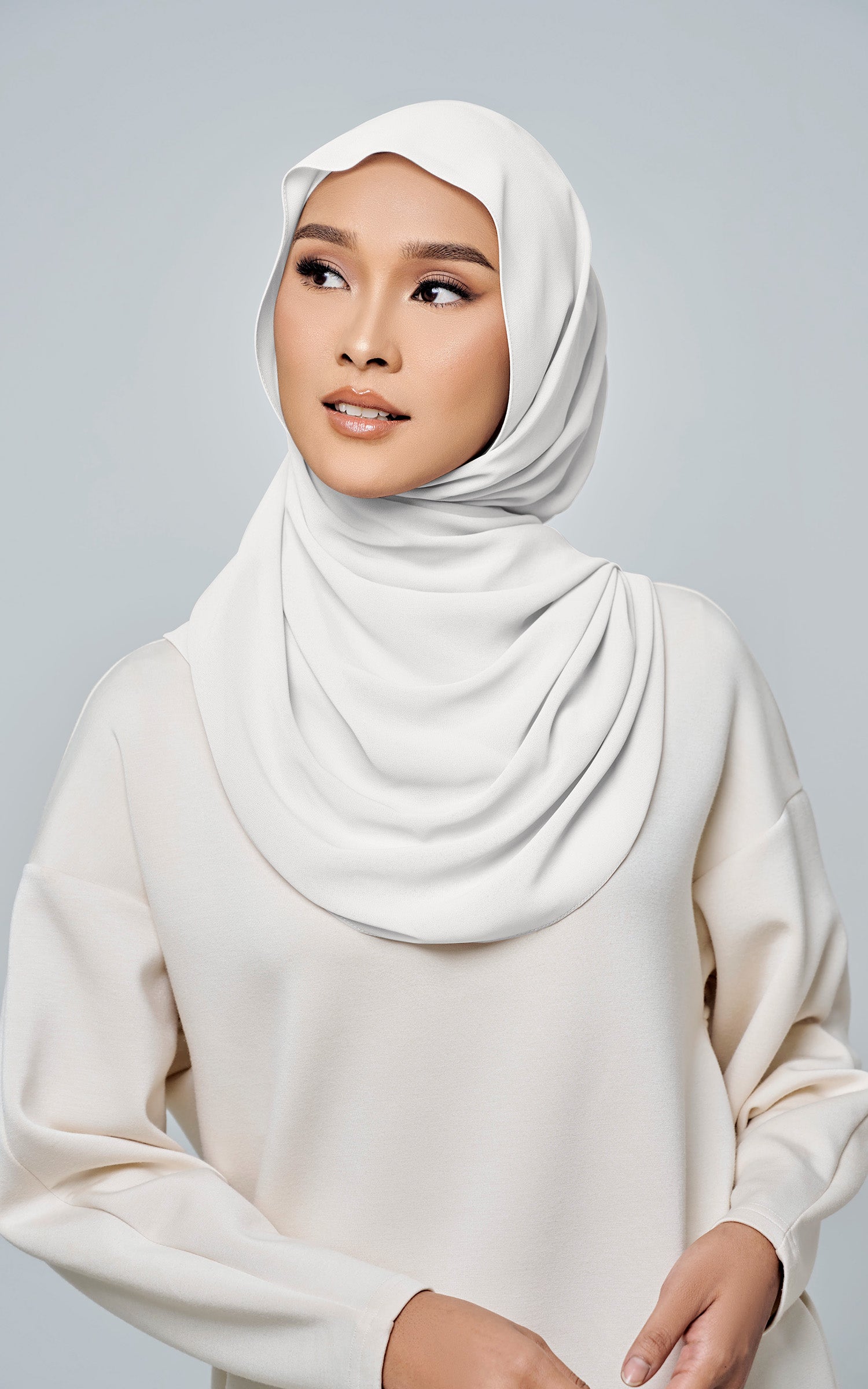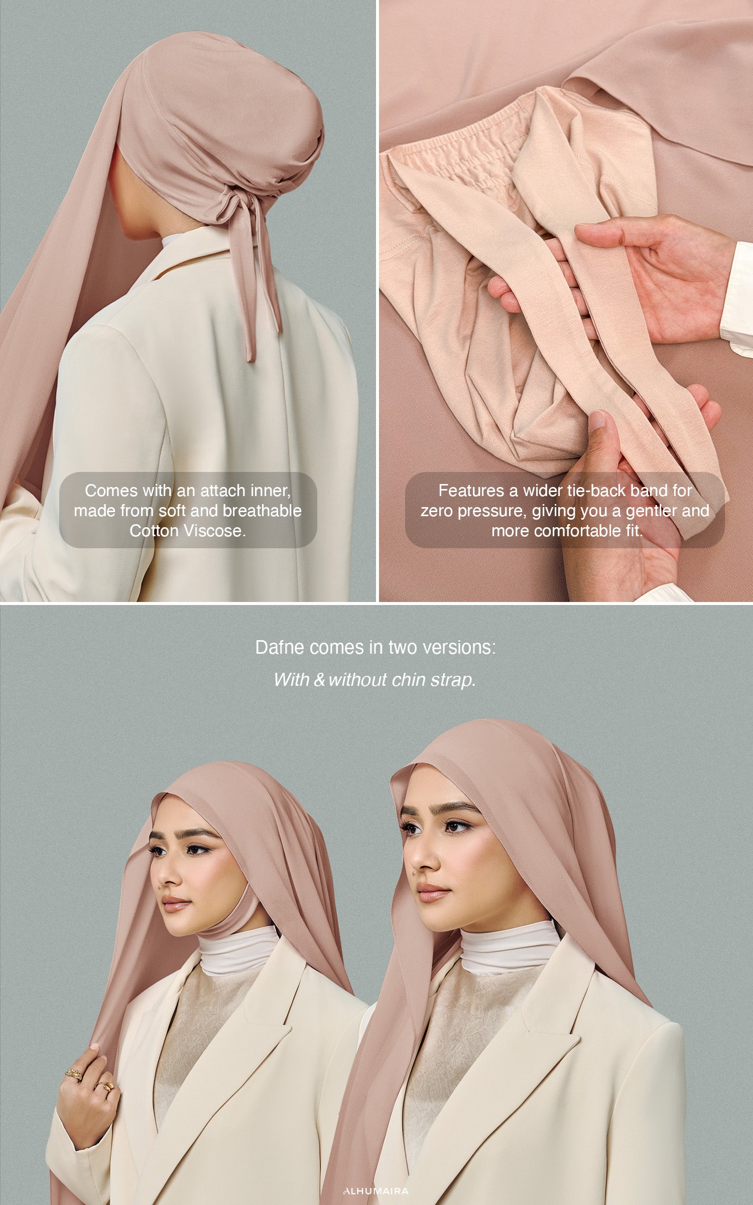 Crafted from High Quality Pearl Chiffon, Dafne maintains its signature lightweight, flowy drape that moves beautifully with you. The attached inner, made from soft and breathable Cotton Viscose, now comes with a wider and more supportive tie-back band. This new design reduces pressure around the ears, giving you a gentler, more comfortable fit even after long hours of wear. The improved inner also caters perfectly to all face shapes and sizes, offering a smooth and refined silhouette.