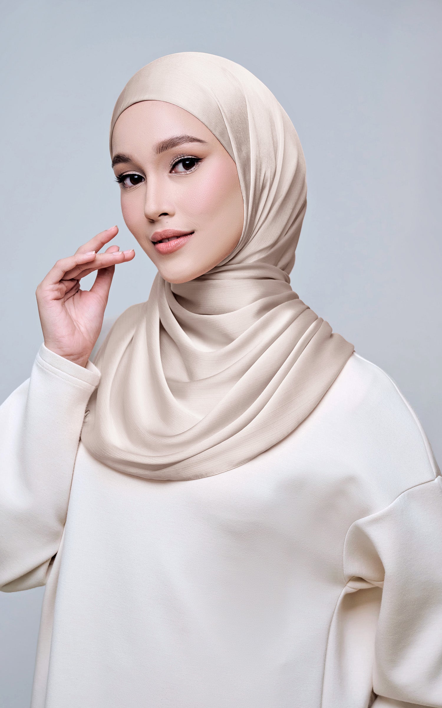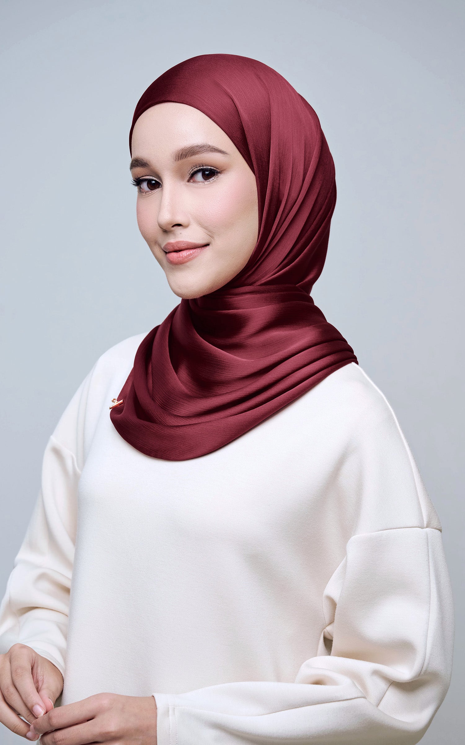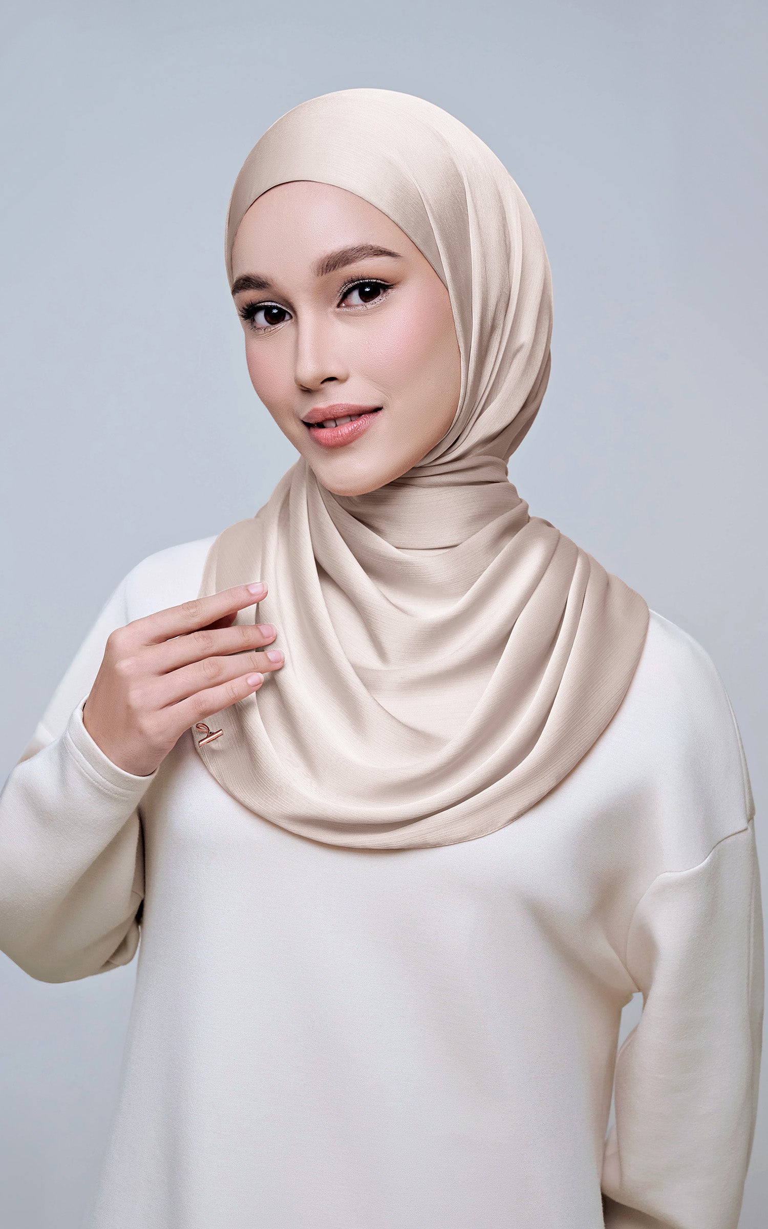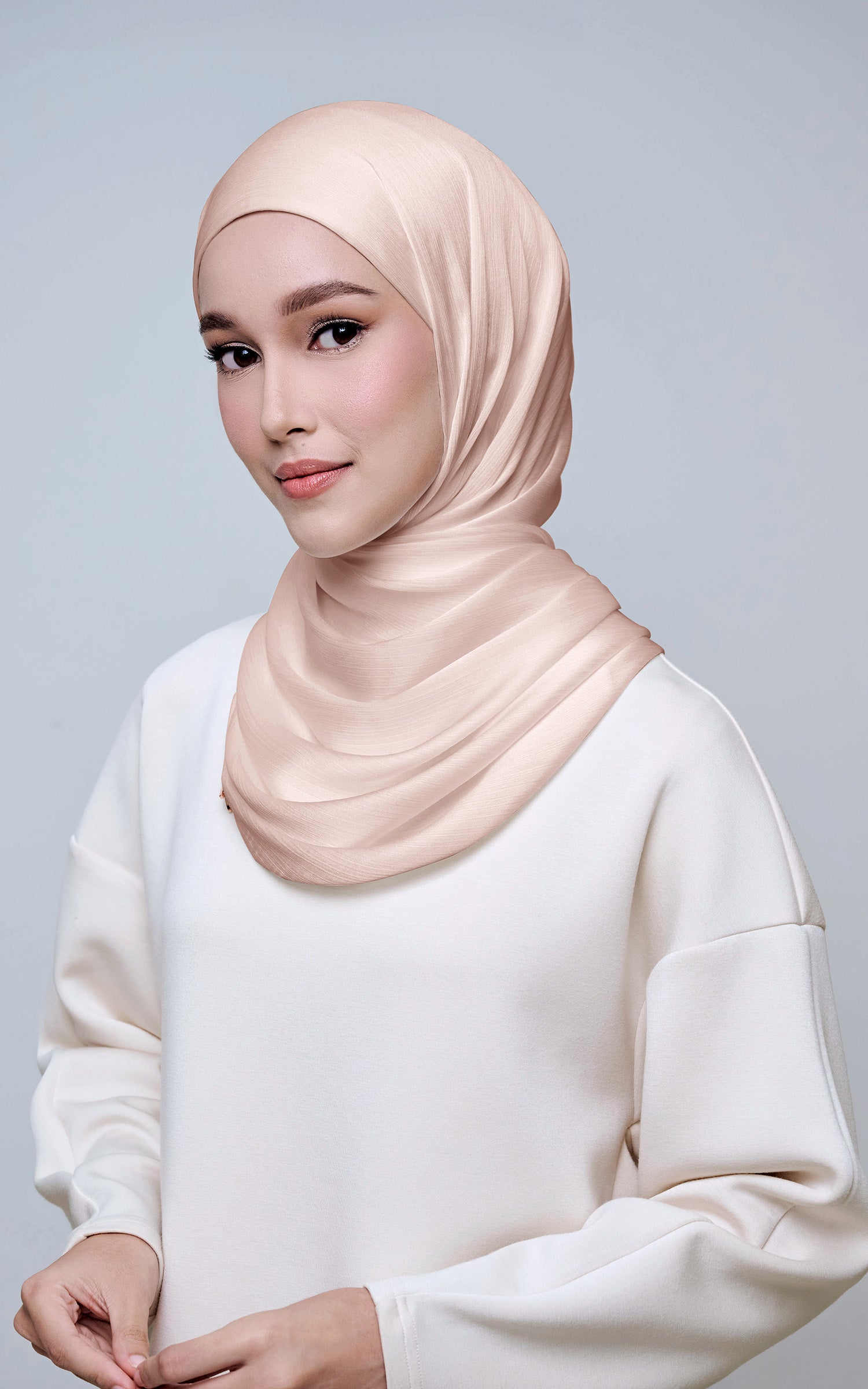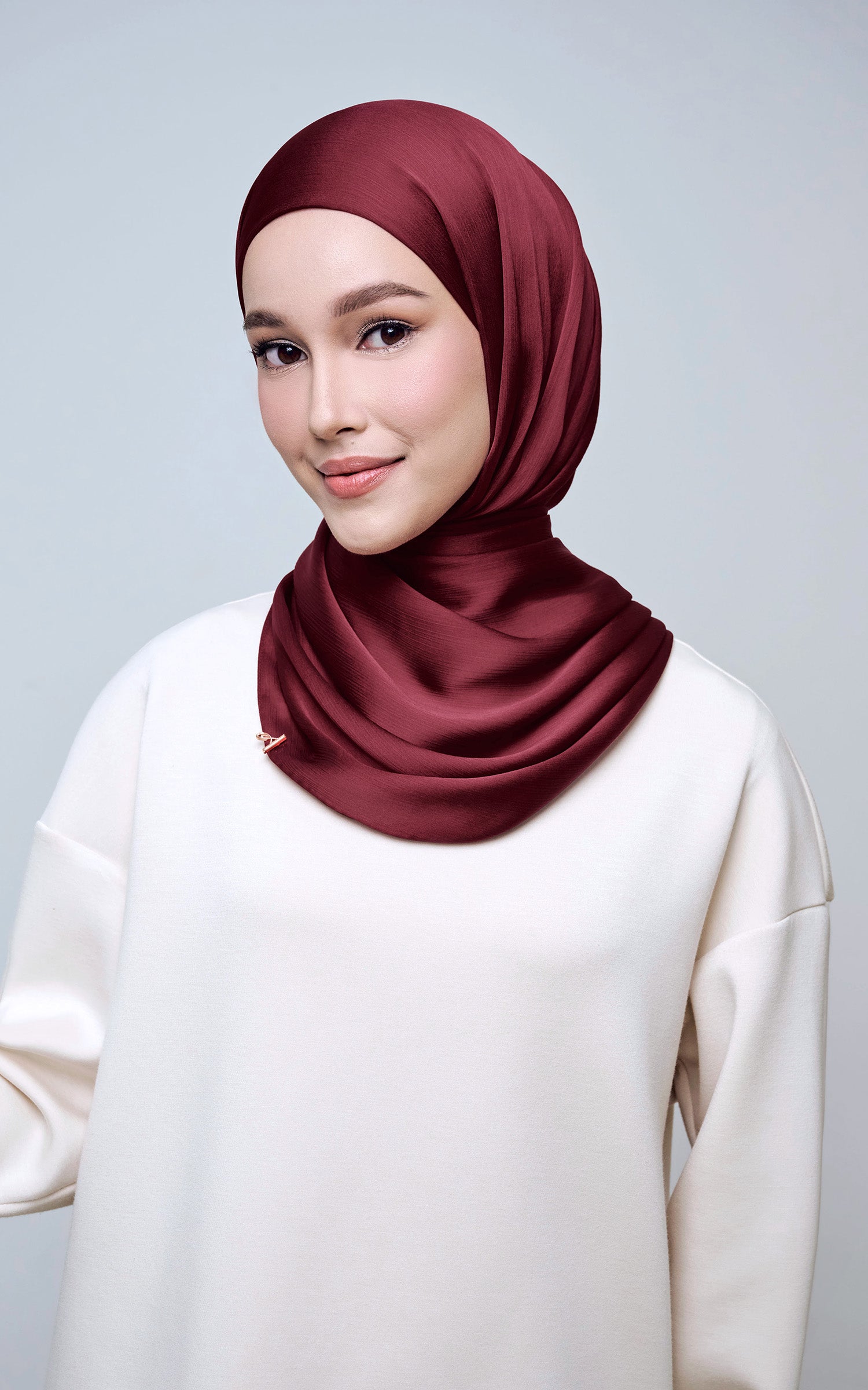 Maysa is crafted from Premium Satin Yoryu, a flowy textured satin that features a soft shimmer to enhance your look. It comes with a built-in tie-back inner in the same colour as the shawl, eliminating the need for colour matching or extra layers. While it’s not as lightweight as our Darla collection, its slightly heavier weight gives it a beautiful drape that stays in place and adds a graceful flow to your styling. With its generous length, Maysa allows you to create a variety of shawl looks effortlessly. Its material becomes fully opaque when folded, making it both practical and sophisticated.
