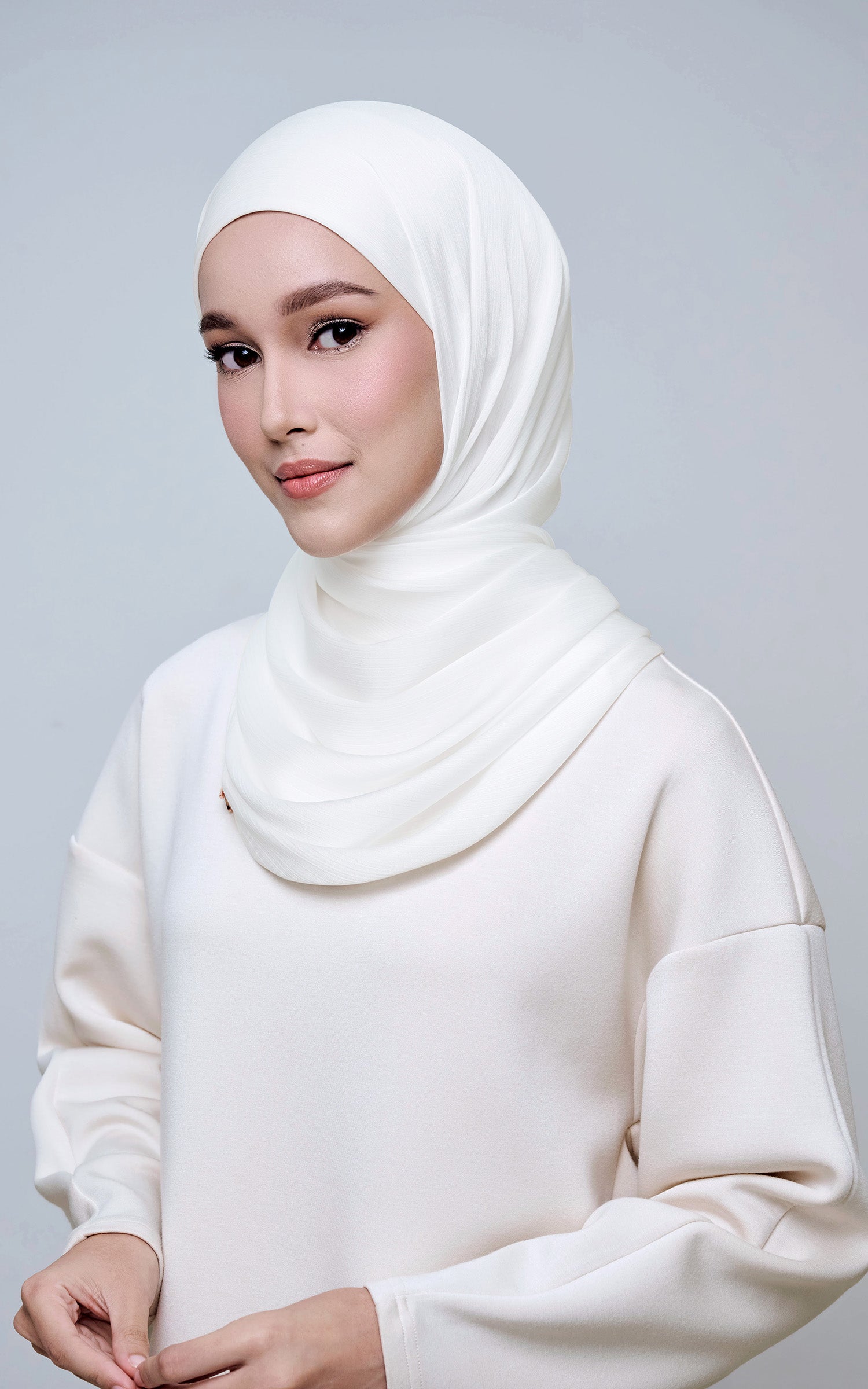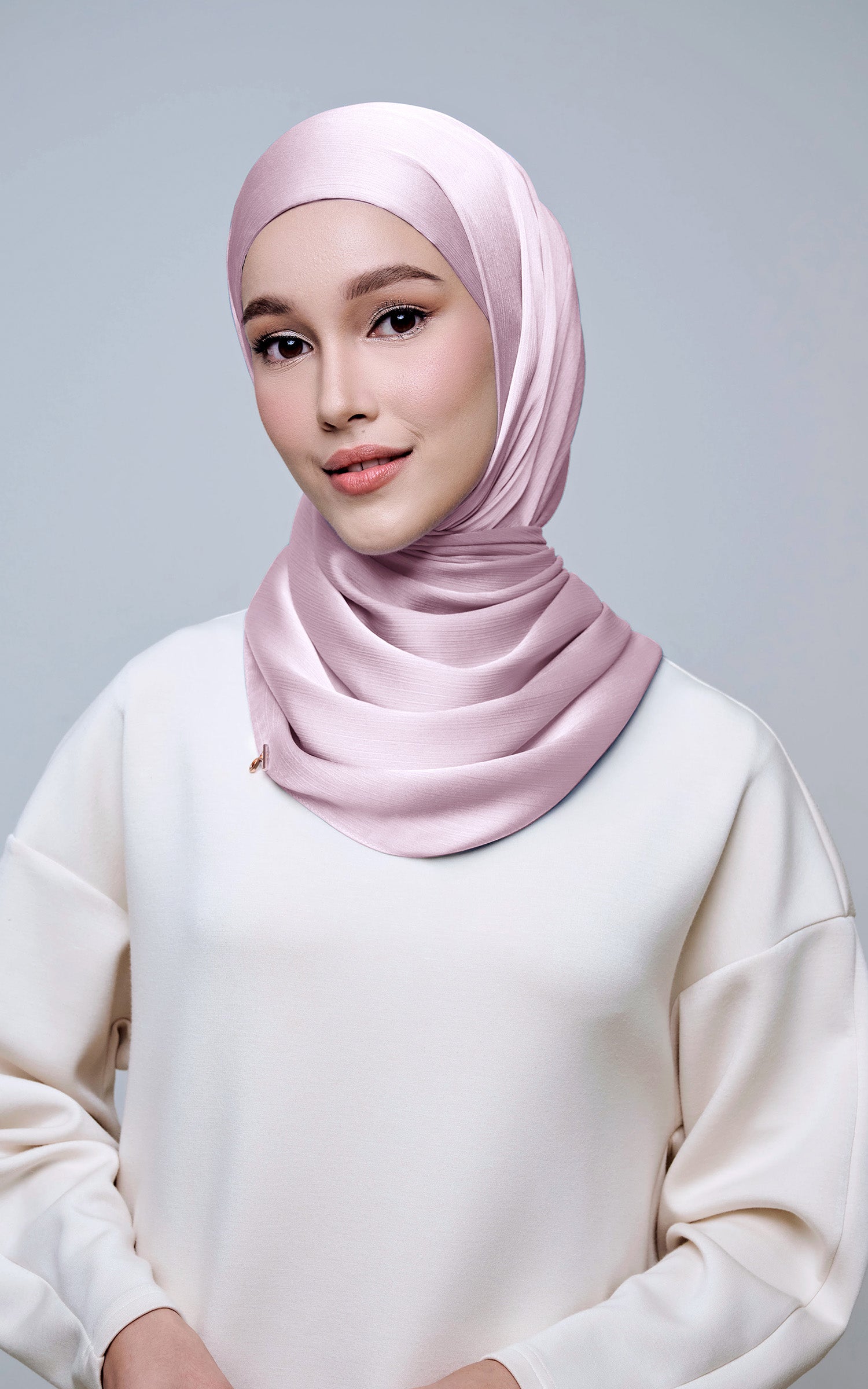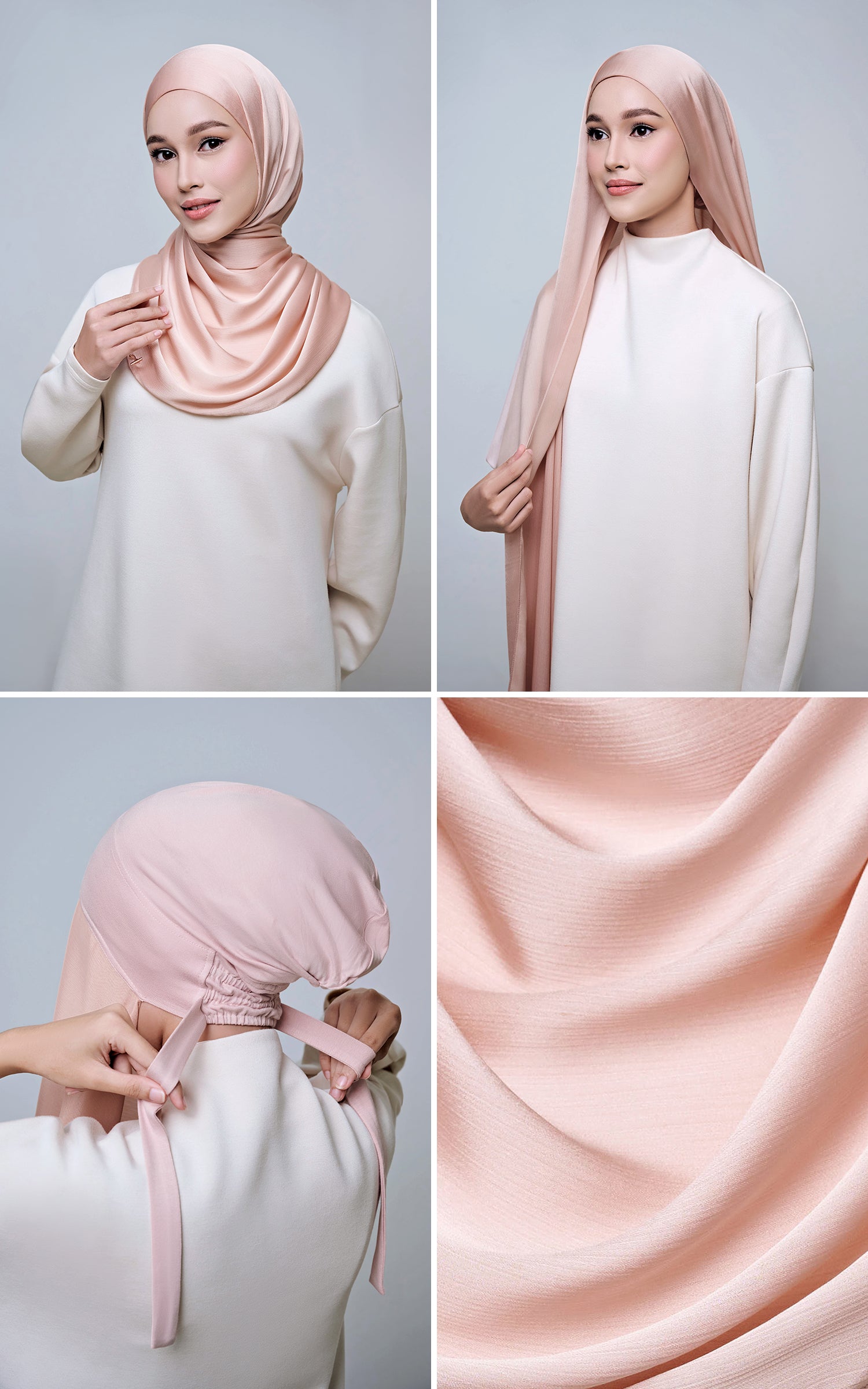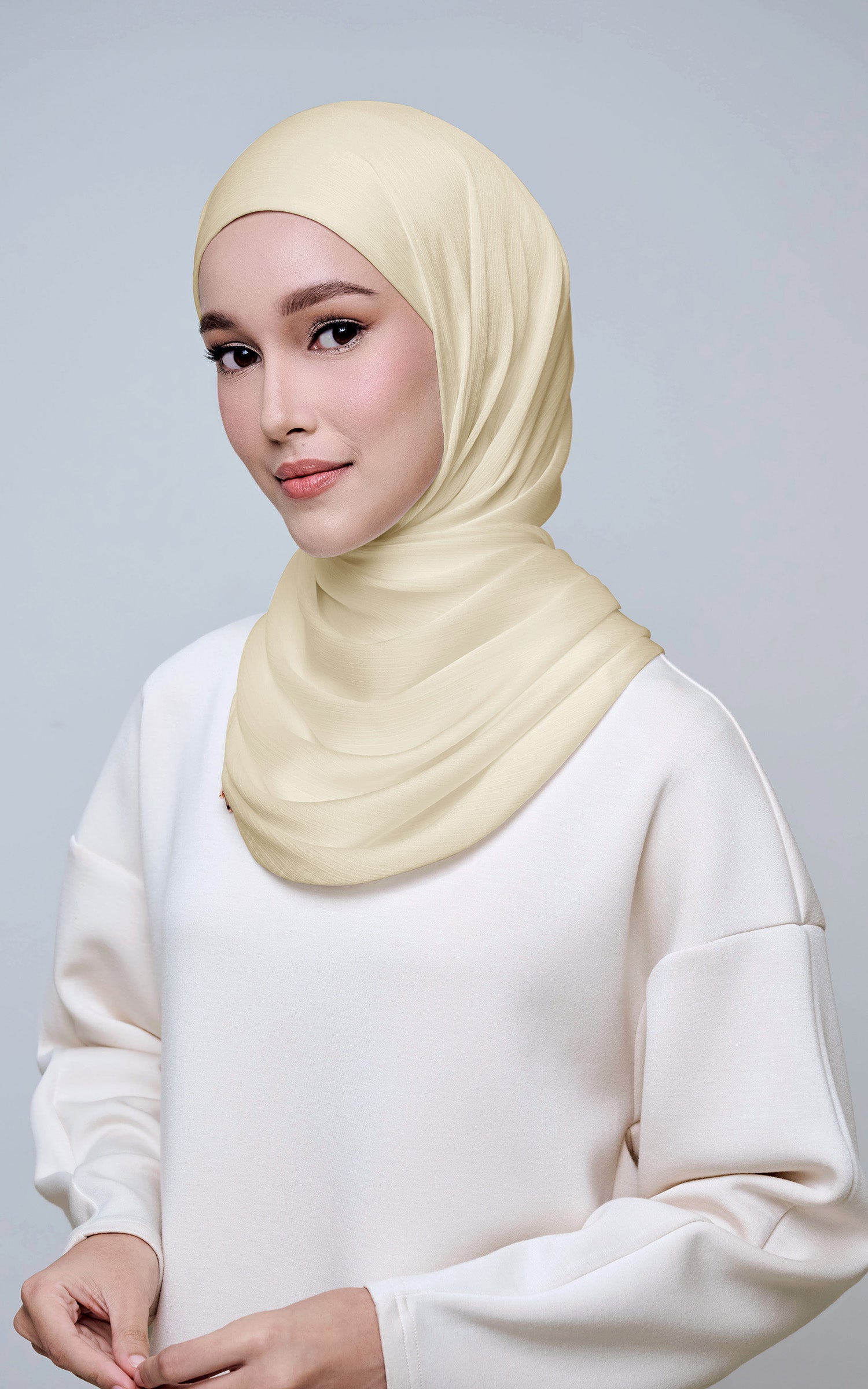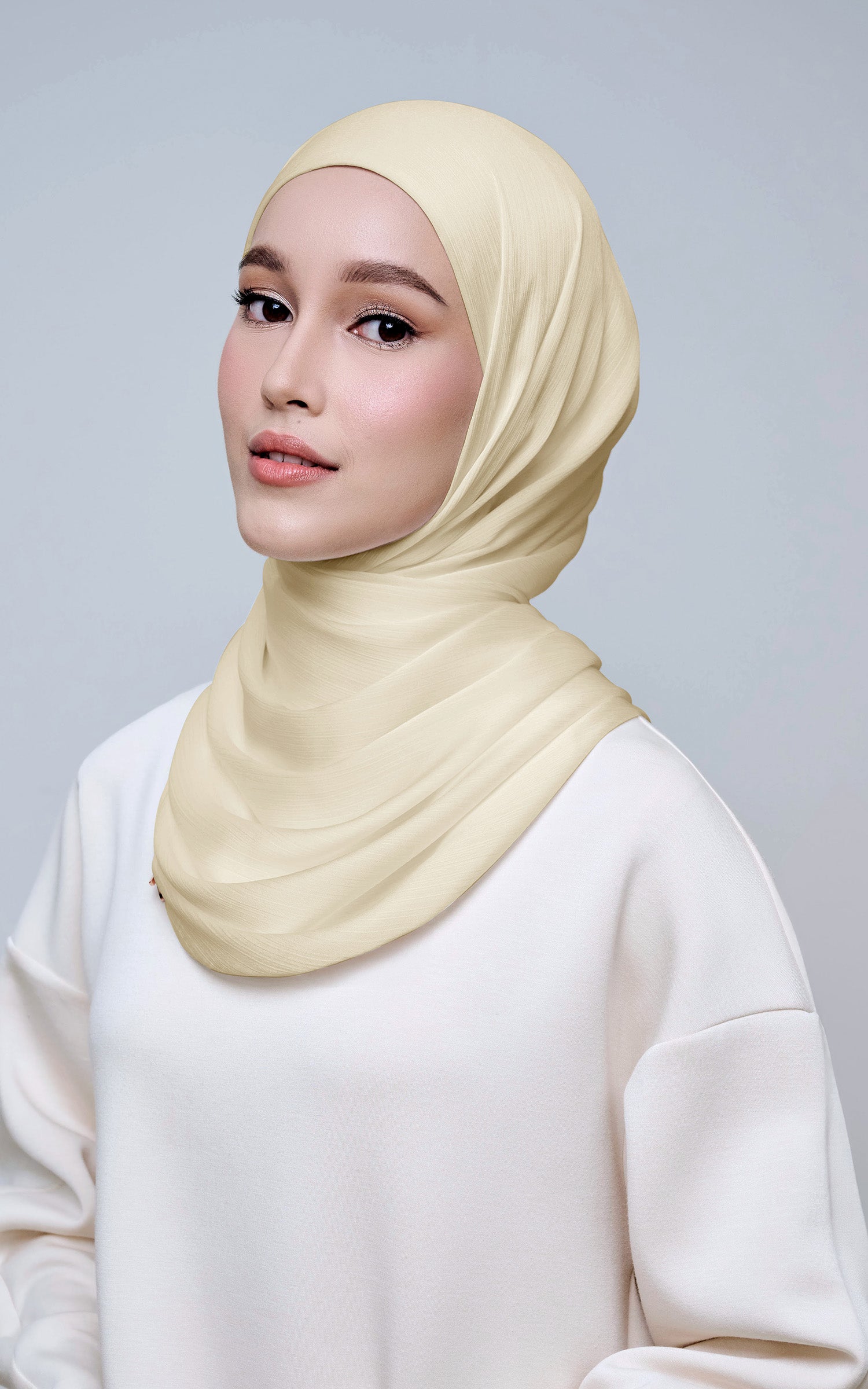 Maysa is crafted from Premium Satin Yoryu, a flowy textured satin that features a soft shimmer to enhance your look. It comes with a built-in tie-back inner in the same colour as the shawl, eliminating the need for colour matching or extra layers. While it’s not as lightweight as our Darla collection, its slightly heavier weight gives it a beautiful drape that stays in place and adds a graceful flow to your styling. With its generous length, Maysa allows you to create a variety of shawl looks effortlessly. Its material becomes fully opaque when folded, making it both practical and sophisticated.