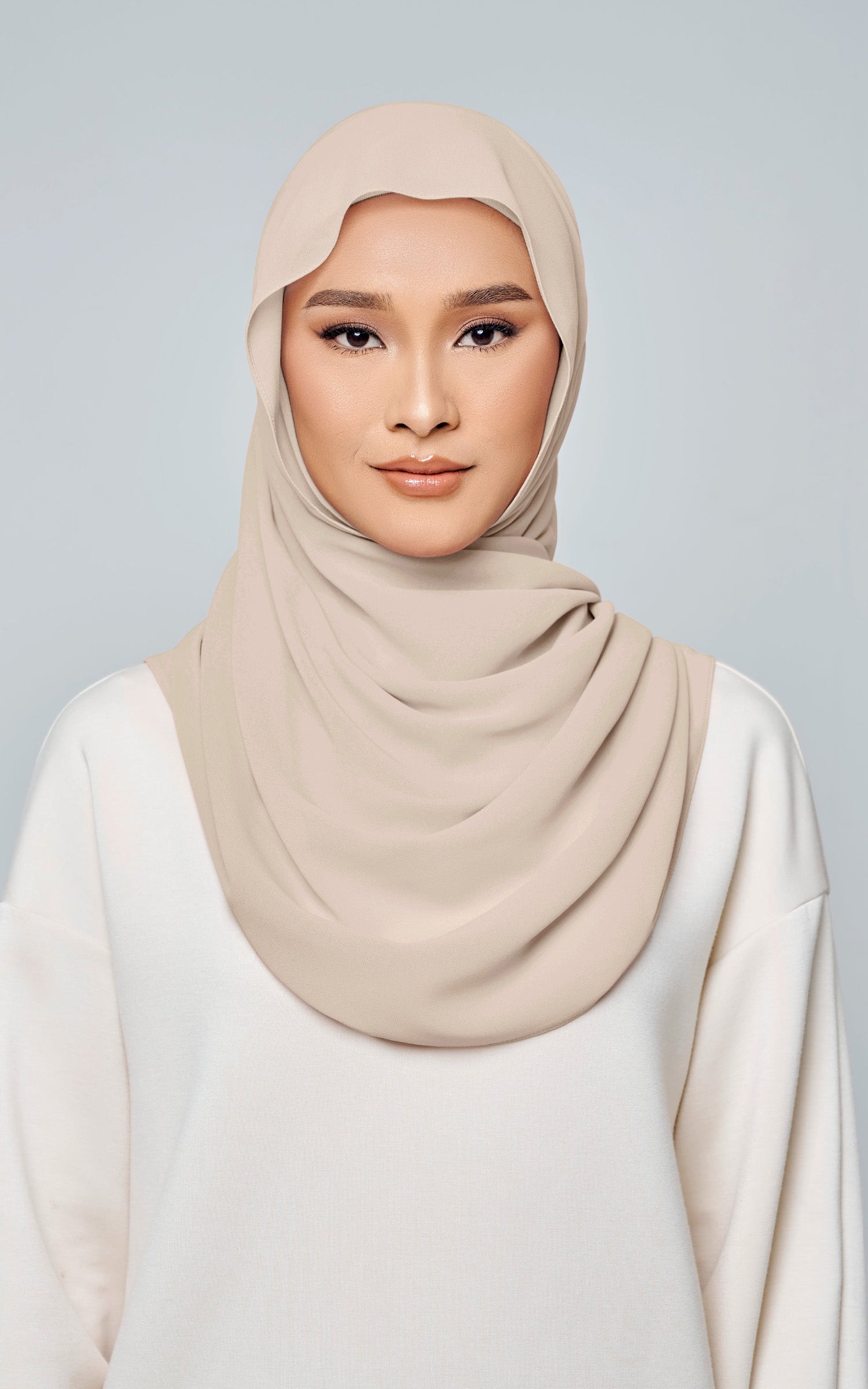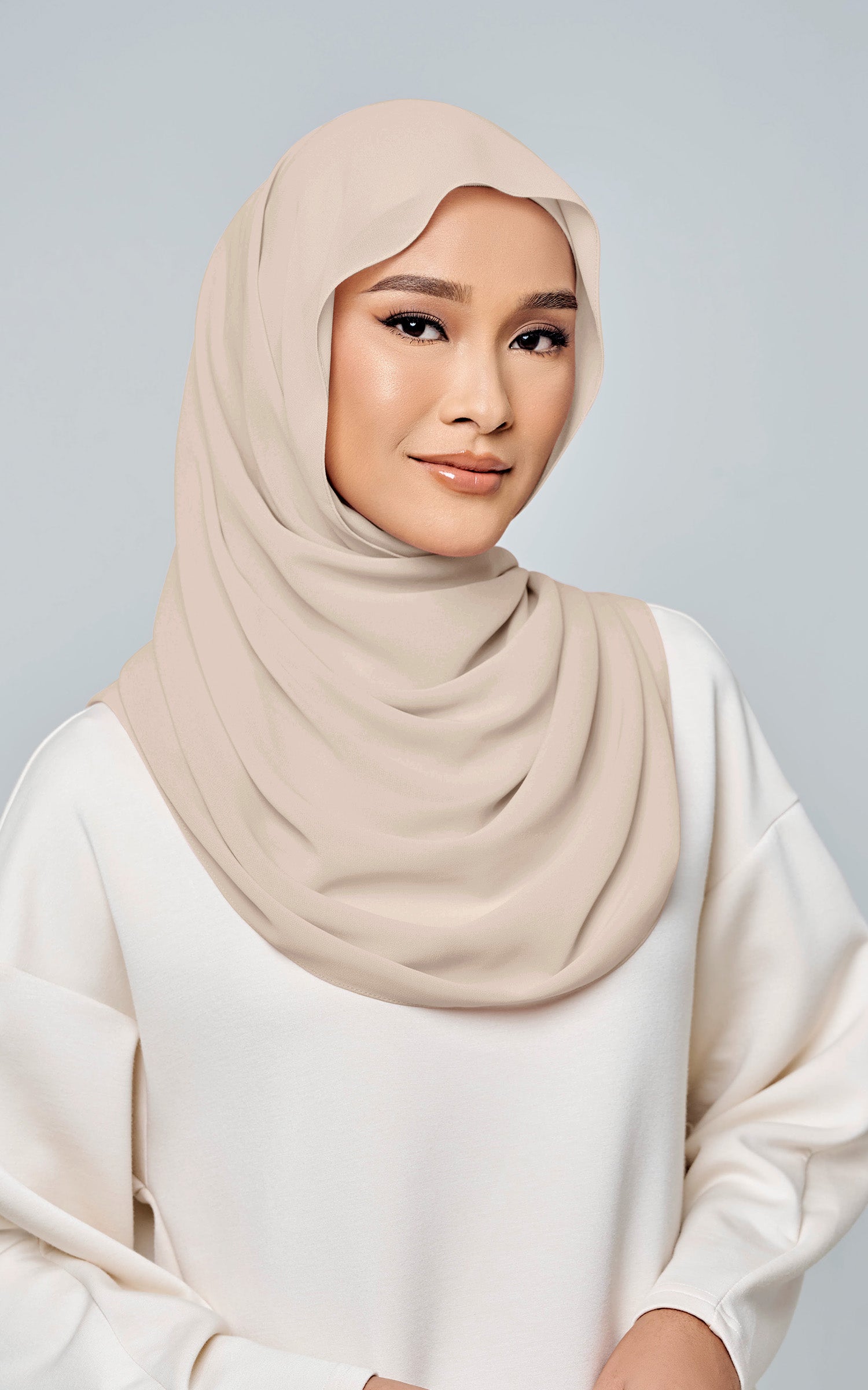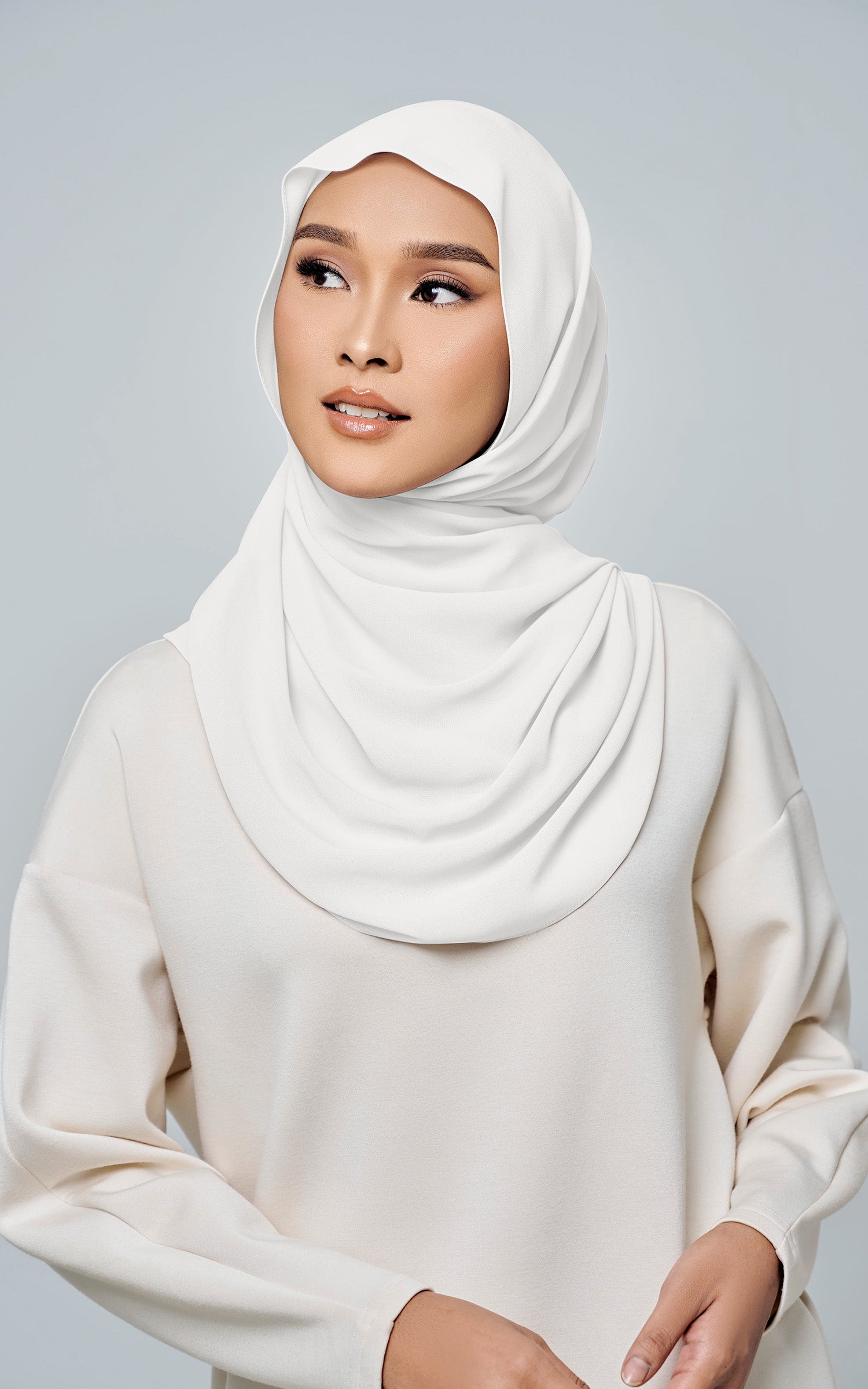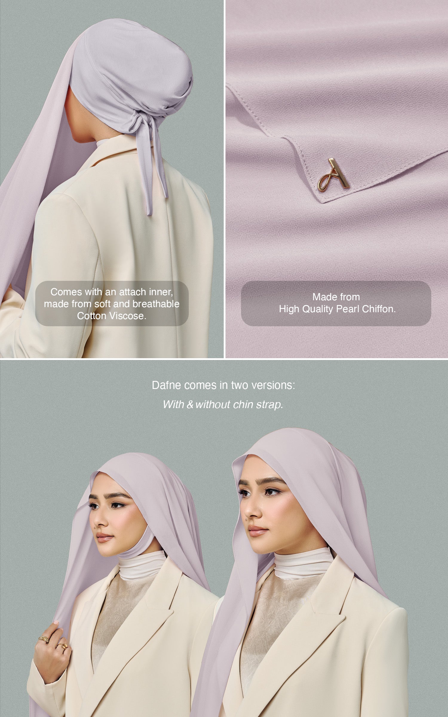 Crafted from High Quality Pearl Chiffon, Dafne maintains its signature lightweight, flowy drape that moves beautifully with you. The attached inner, made from soft and breathable Cotton Viscose, now features a new design without the band under the ears giving you a gentler, more comfortable fit even after long hours of wear. The improved inner fit also caters perfectly to all face shapes and sizes, ensuring a smooth and elegant look.