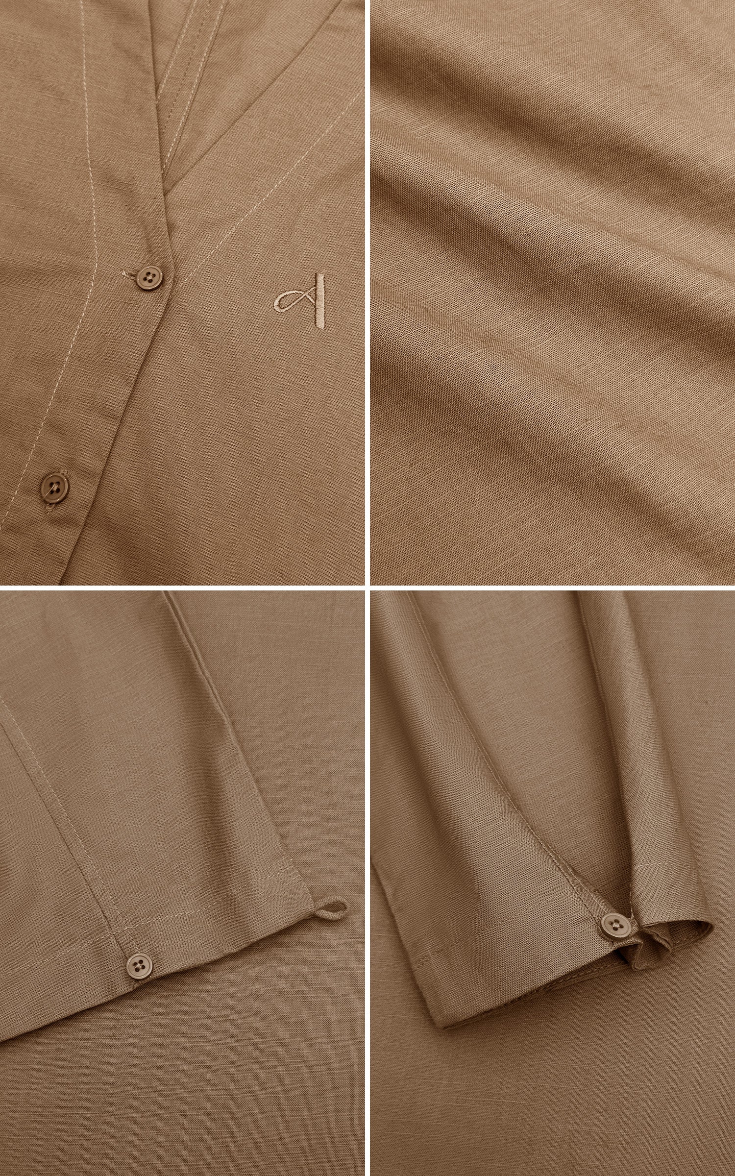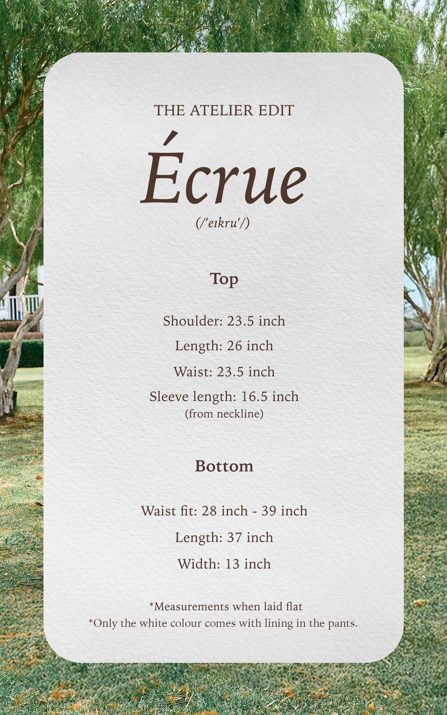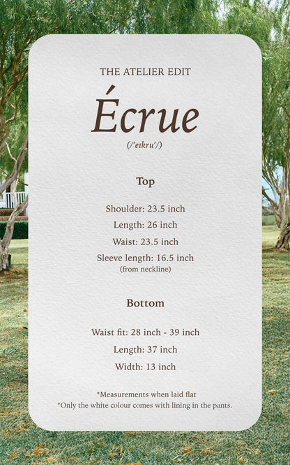 Écrue celebrates the beauty of natural textures through a refined blouse and pants set crafted from Luxe Cotton Linen. Écrue embodies the quiet luxury of linen, designed as a matching blouse and pants set that captures effortless sophistication. The breathable linen fabric brings a natural texture and relaxed elegance, while the clean silhouette allows the piece to feel both polished and easy to wear. Thoughtfully designed for comfort and versatility, Écrue offers a timeless look that moves seamlessly from day to evening, an understated expression of modern refinement.