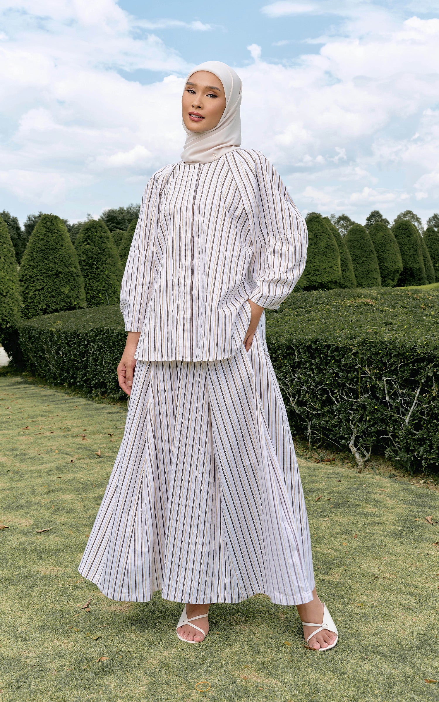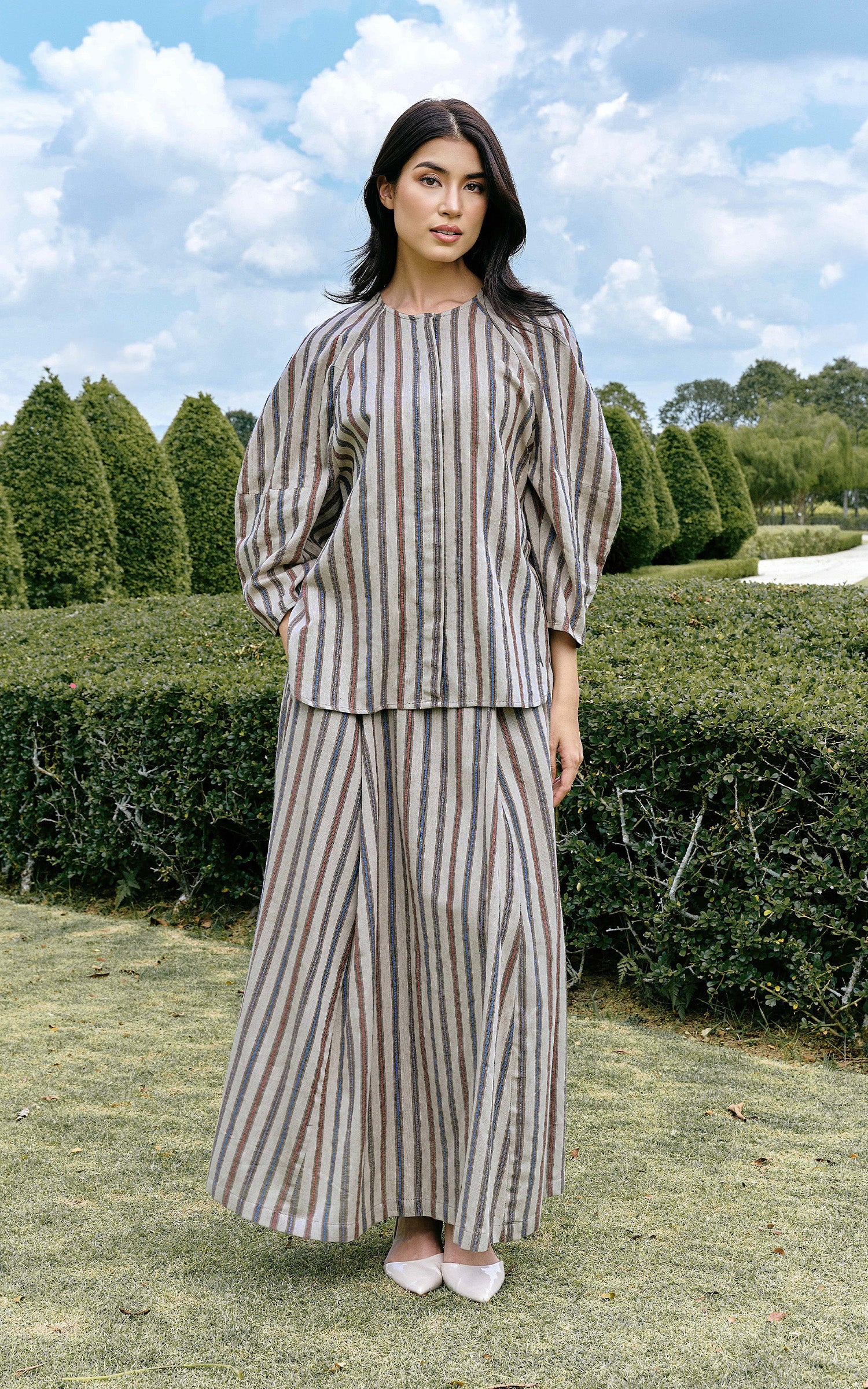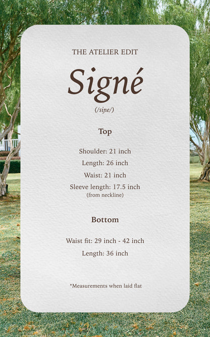 Signé, French for “signed,” reimagines stripes as a refined signature detail. Crafted from Premium Printed Cotton, the blouse and A-line skirt offer a perfect balance of structure and comfort. The fabric is lightweight, breathable, and softly textured, allowing the striped pattern to appear crisp while maintaining a natural drape. The A-line silhouette introduces graceful movement and a flattering shape, creating a look that feels polished yet effortless. Modern and timeless, Signé is designed for women who appreciate clean lines, refined fabrics, and quiet sophistication.