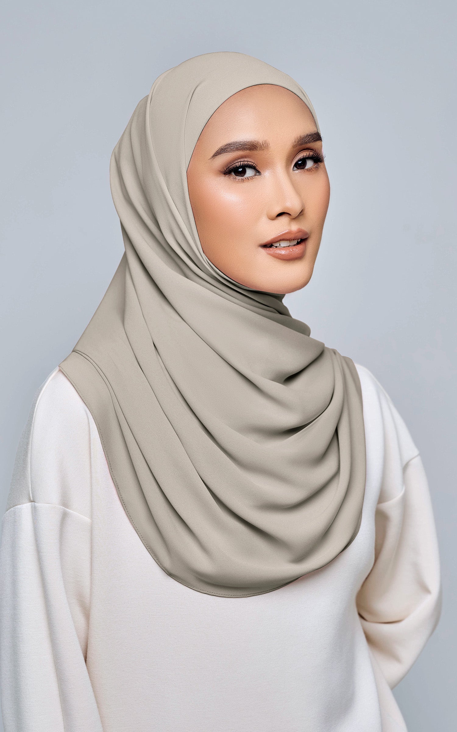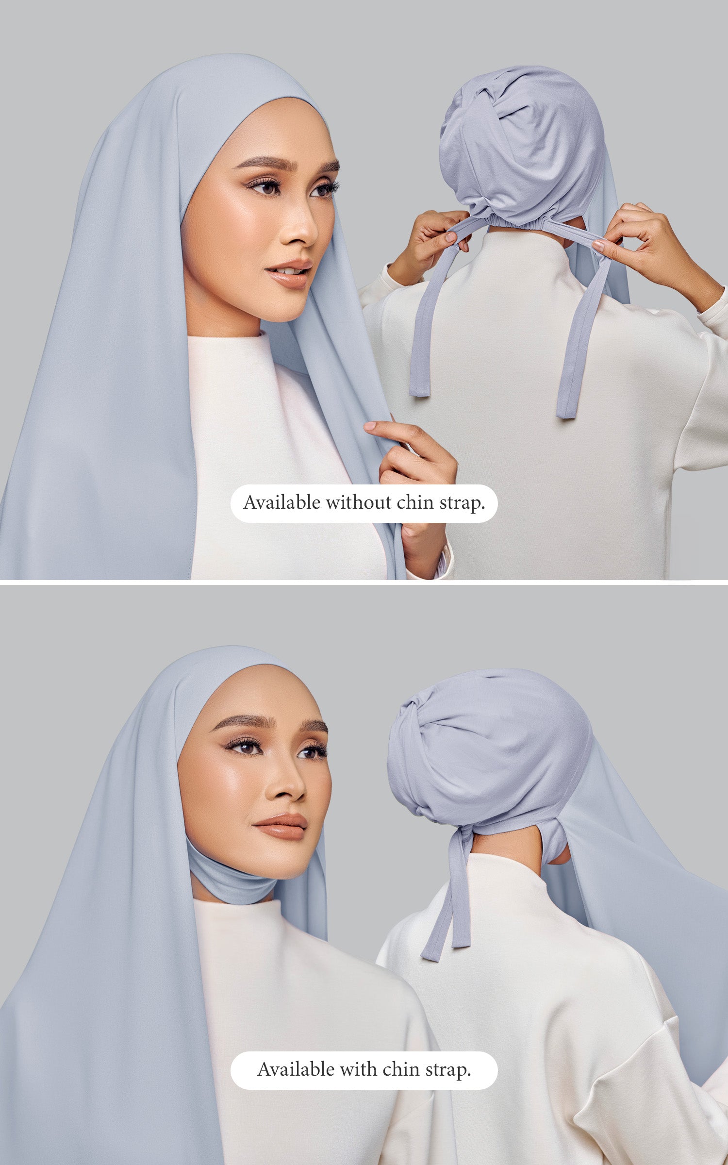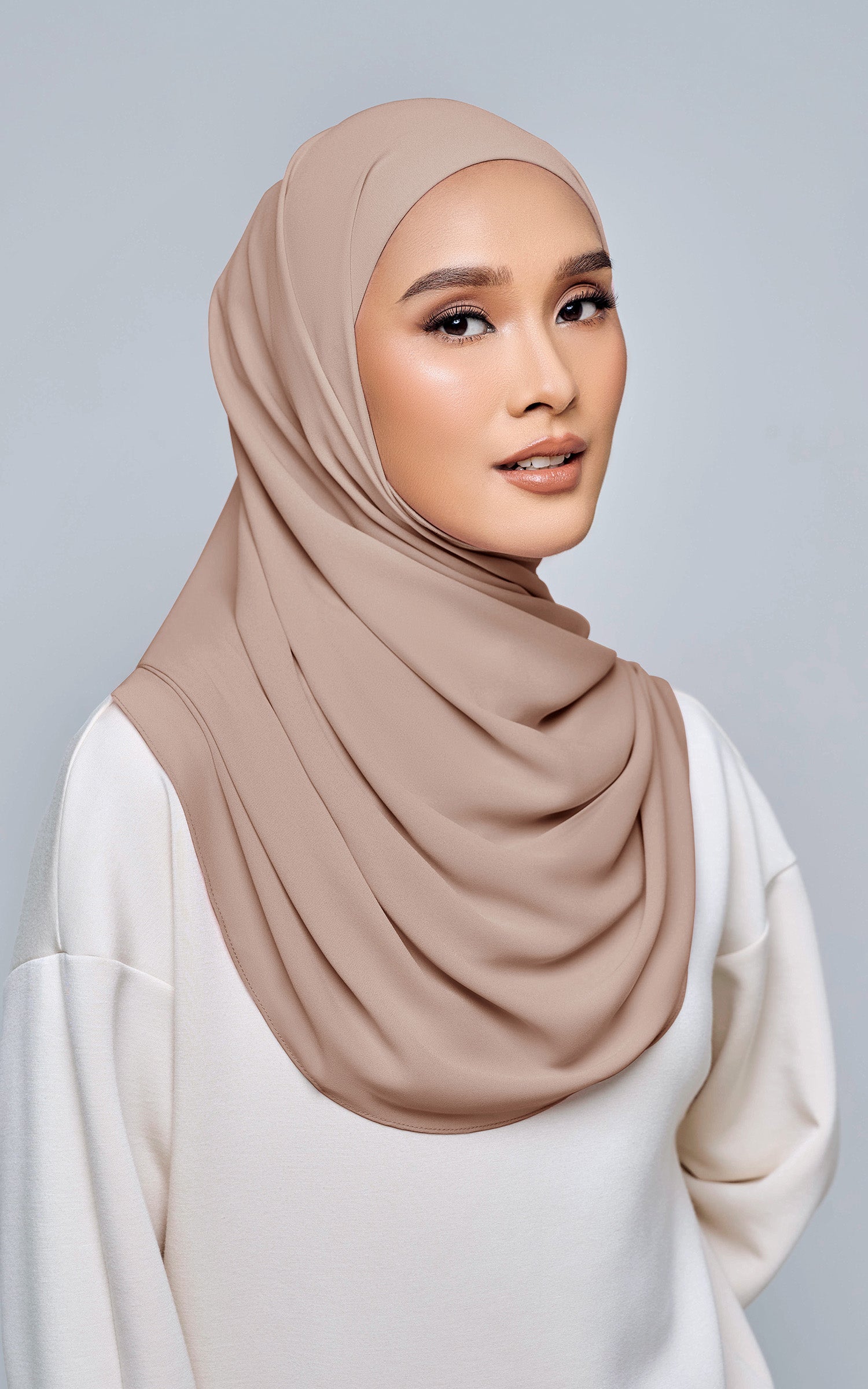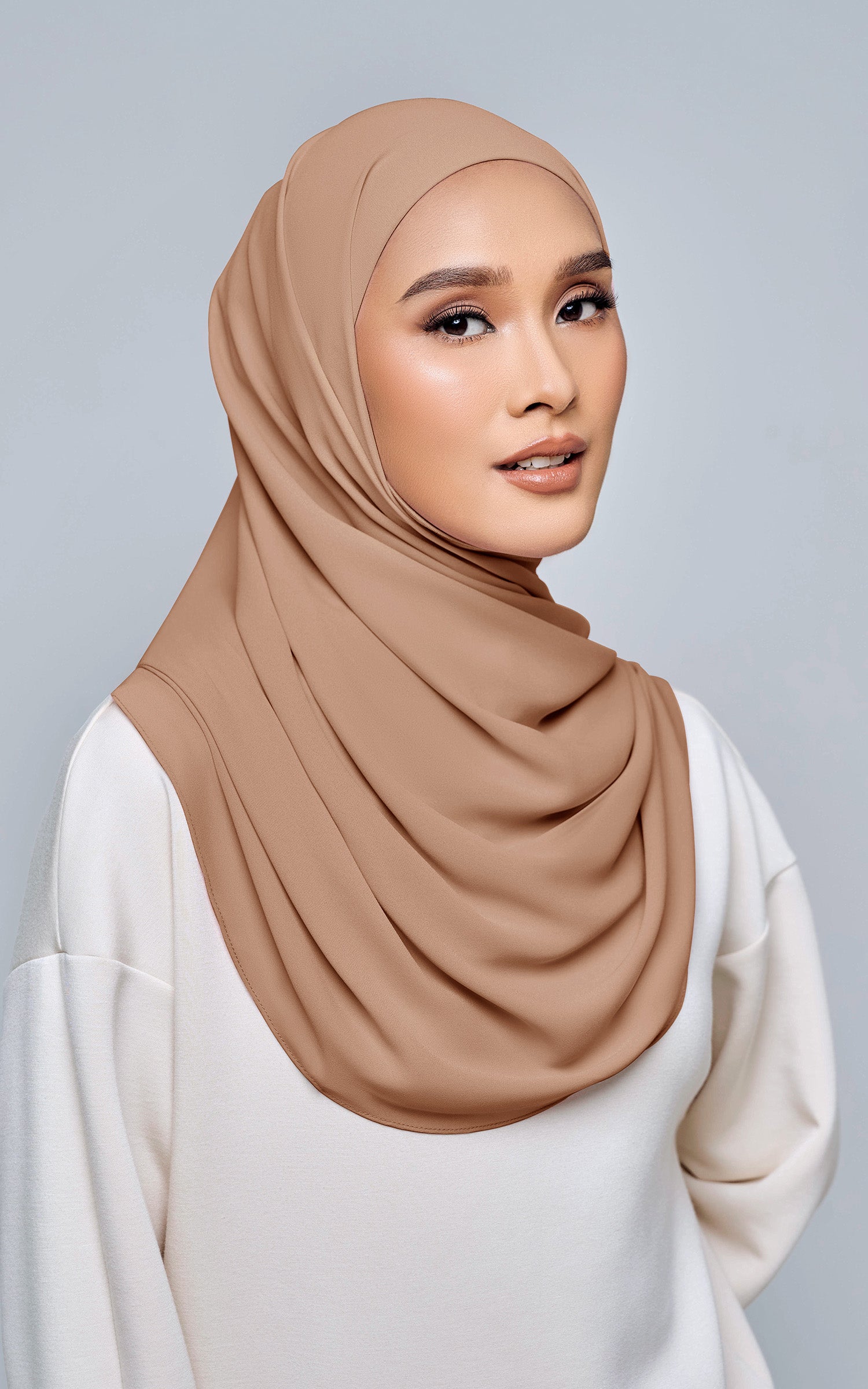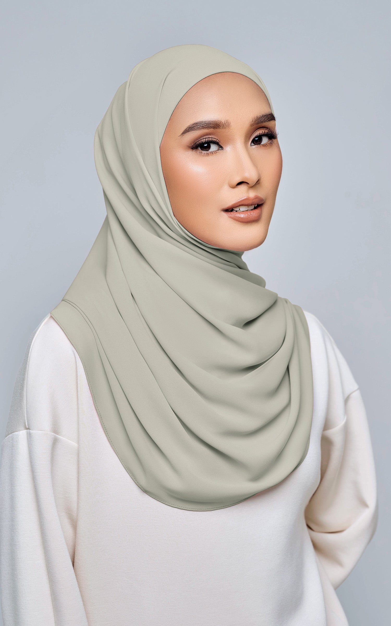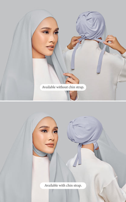 Starla is your go-to instant hijab that combines elegance and ease. Designed with a half moon shape for better coverage and flow, Starla features an attached inner made from Cotton Viscose, complete with a tie-back and secure band to ensure it stays in place. The hijab is crafted from Original Korean Chiffon, a material known for its lightweight, airy, and breathable properties. Starla’s baby seam stitching provides a refined finish, while the adjustable styling options allow you to wear it neatly, highlighting your face beautifully. Choose from two options: with a chin strap for added security or without for a more relaxed fit. This instant hijab is quick and easy to style, perfect for busy women who want to look fashionable effortlessly.