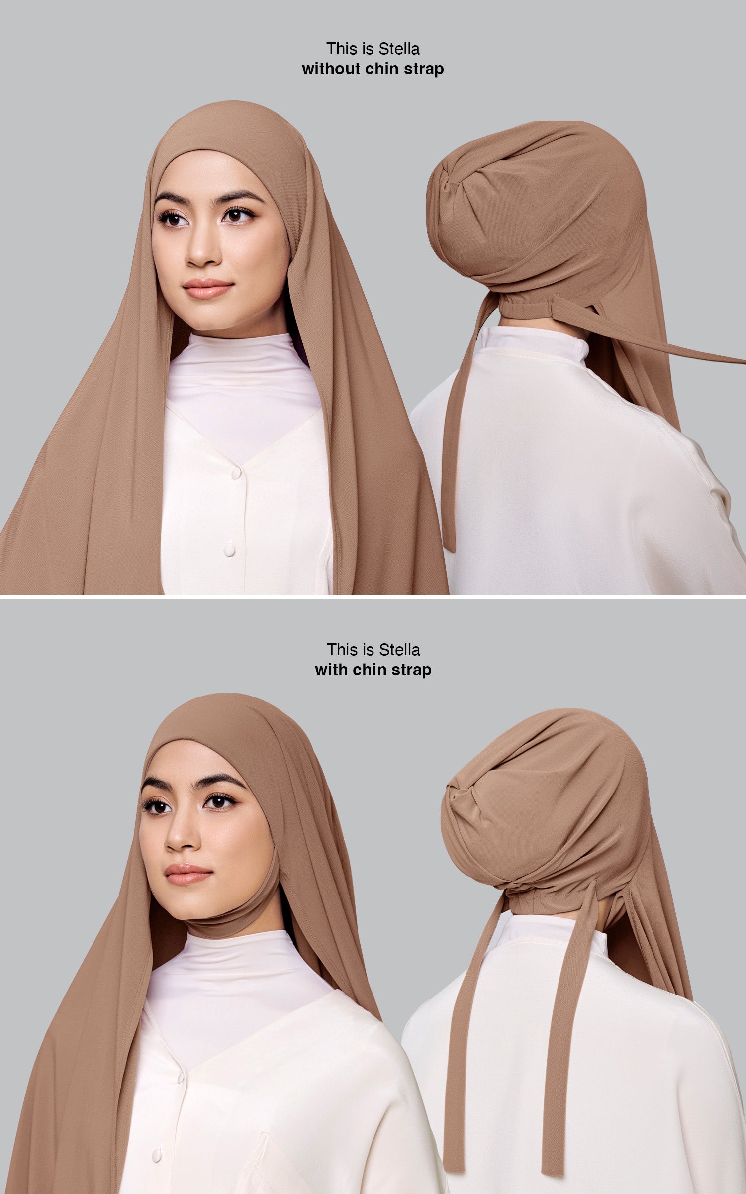 Stella is making a comeback, our best-selling instant hijab made from Rosy Twill Crepe, a fabric loved for its wrinkle resistance, durability, and luxurious drape. Designed with comfort in mind, Stella comes with an attached inner in a matching color and an adjustable back band for a perfect fit. Now, we’re giving you even more options. Choose with a chin strap for extra security or without for a sleek, effortless look.