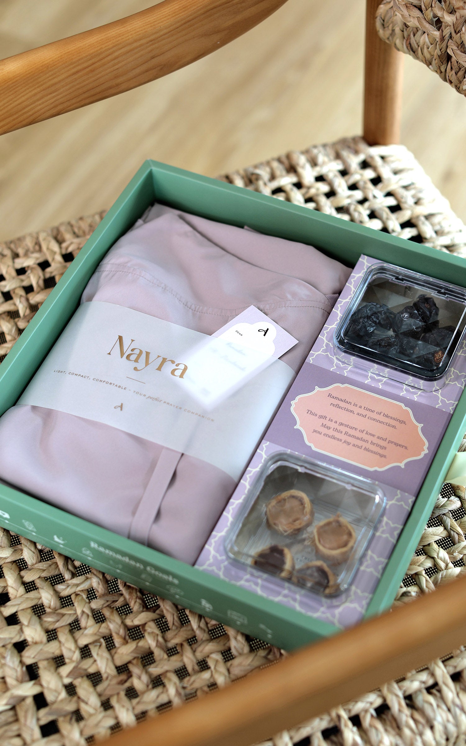 Inside, you'll find the Alhumaira Travel Telekung - Nayra, a lightweight and compact prayer companion designed for comfort, along with Ajwa Dates, a nutritious staple for breaking fast, and the delectable Ouch El Boulboul Baklava, a handcrafted Middle Eastern treat. To make this box even more meaningful, we’ve included an exclusive Ramadan gift card, allowing you to share love and prayers with those who matter most.
