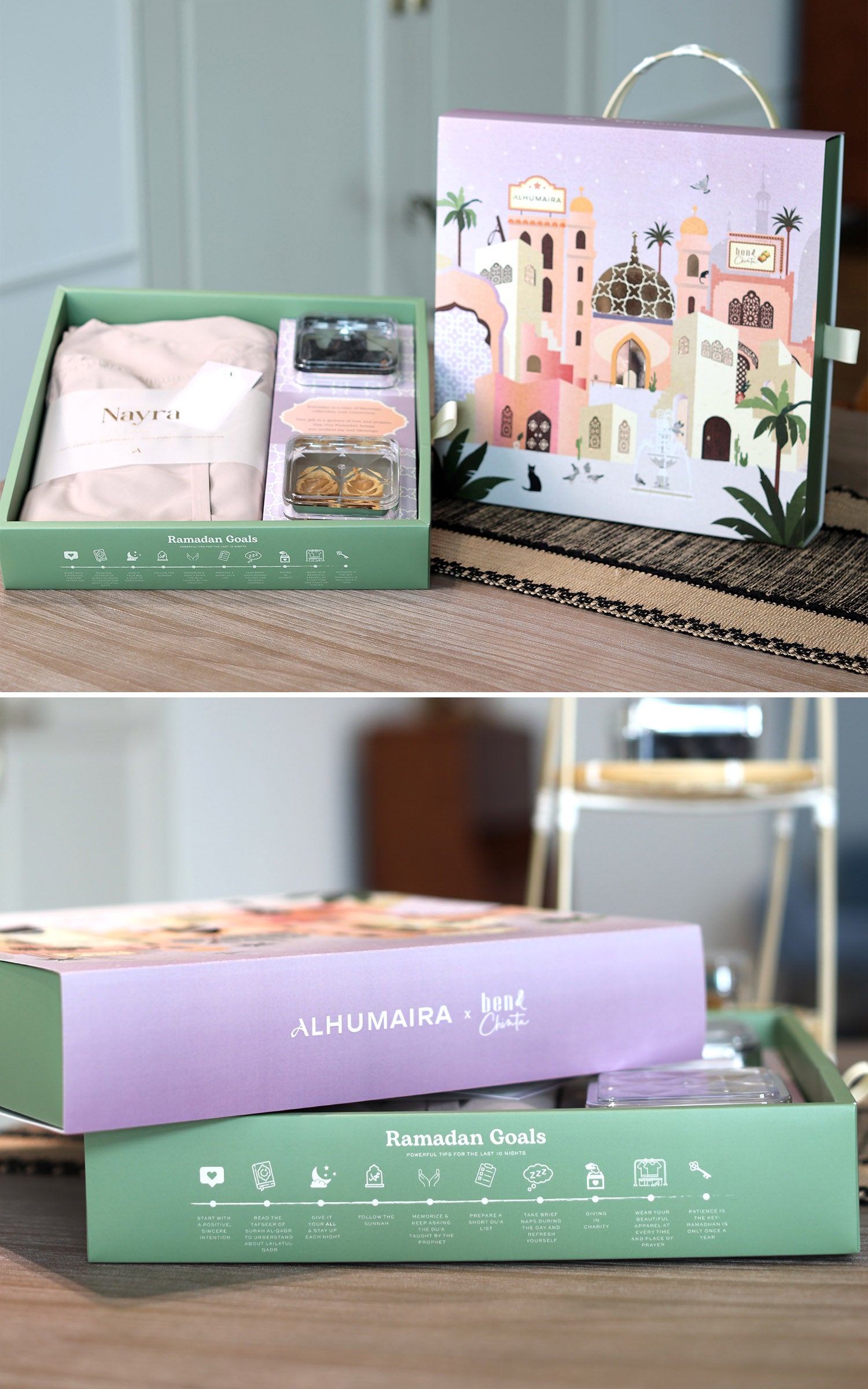 This Ramadan, Alhumaira is proud to collaborate with local favorite Ben & Chinta, renowned for their exquisite cookies and sweets, to bring you a truly special Ramadan Box. Thoughtfully curated, this limited-edition set embodies the essence of Ramadan - faith, gratitude, and connection. Designed with intention, the beautifully crafted box features Ramadan goals printed on it, serving as a daily source of inspiration throughout the holy month. Whether as a personal indulgence or a heartfelt gift, the Ramadan Box is a symbol of faith, reflection, and togetherness. Available in limited quantities, order yours today while stocks last!