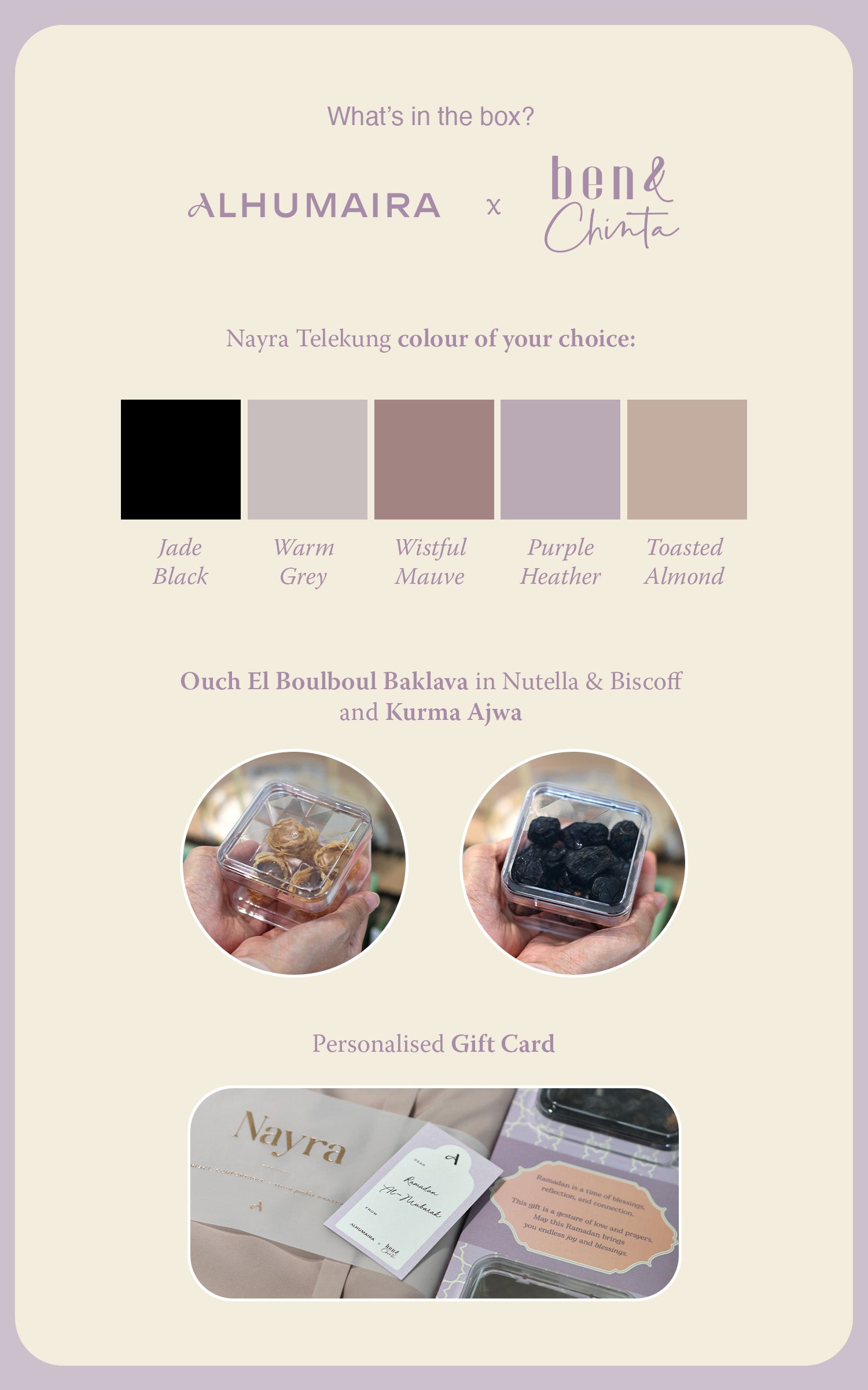 Celebrate the blessings of Ramadan with the exclusive Alhumaira x Ben & Chinta Ramadan Box, a beautifully curated gift that blends spirituality and indulgence. This special edition set features the Alhumaira Travel Telekung - Nayra, a lightweight and compact telekung designed for ease and comfort, perfect for prayers at home or on the go. To complement your iftar, we’ve included Kurma Ajwa, a premium selection of dates packed with natural sweetness and nutrients, along with Ouch El Boulboul Baklava in Biscoff and Nutella flavours, a rich and flaky Middle Eastern delicacy that melts in your mouth. Completing this meaningful set is an exclusive Ramadan gift card, allowing you to send heartfelt messages to your loved ones. The box itself is uniquely designed with Ramadan goals printed on it, serving as a daily source of inspiration. This limited-edition Ramadan Box is available while stocks last.
