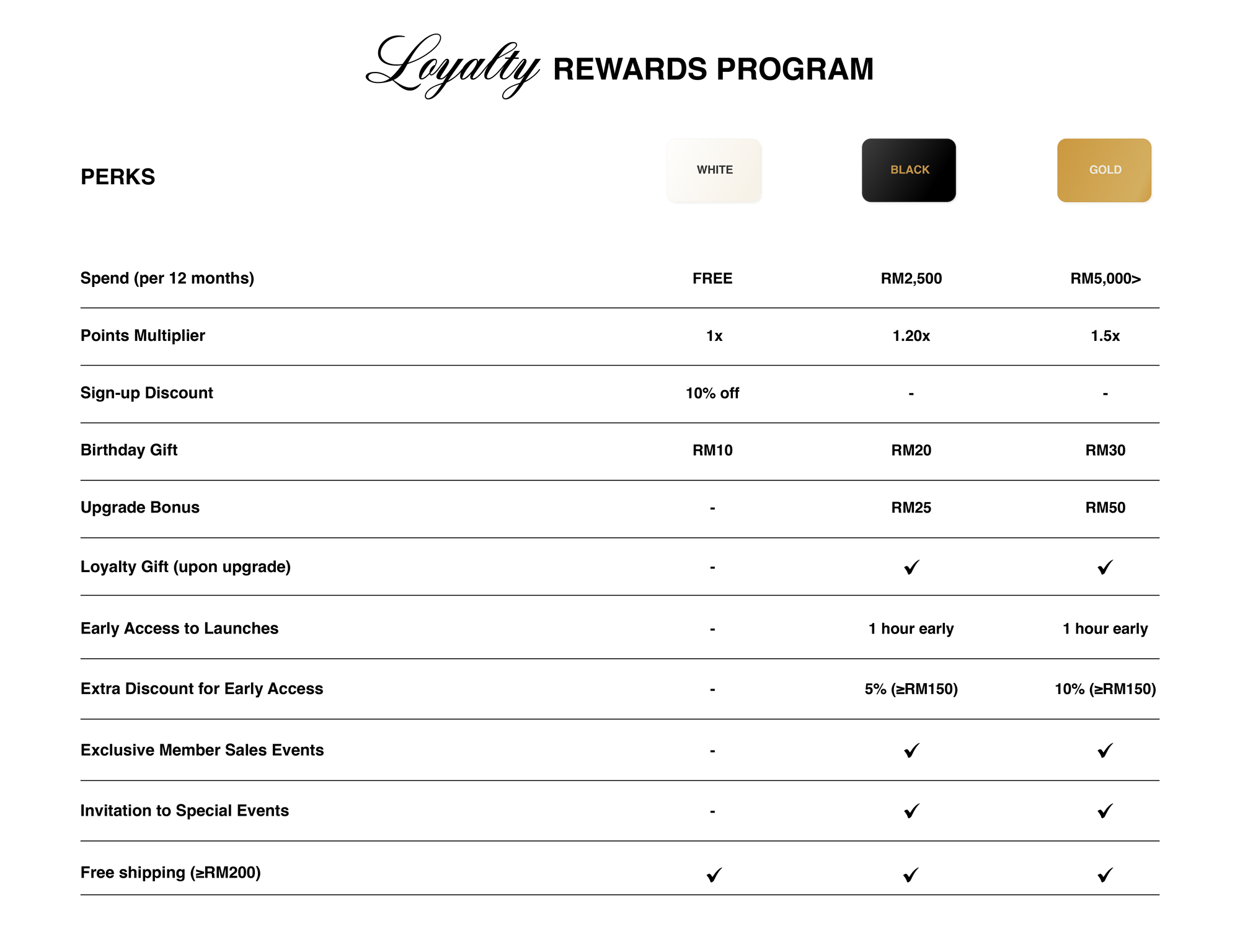 Every ringgit you spend brings you closer to exclusive perks, early access, special gifts, and more. With three rewarding tiers : White, Black, and Gold, this is our way of saying thank you for being part of us.